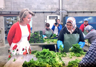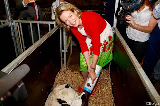At the Ferme de Coux in Maillen bleu-blanc-belge cattle is raised. The Queen was met by ten female farmers from the region.